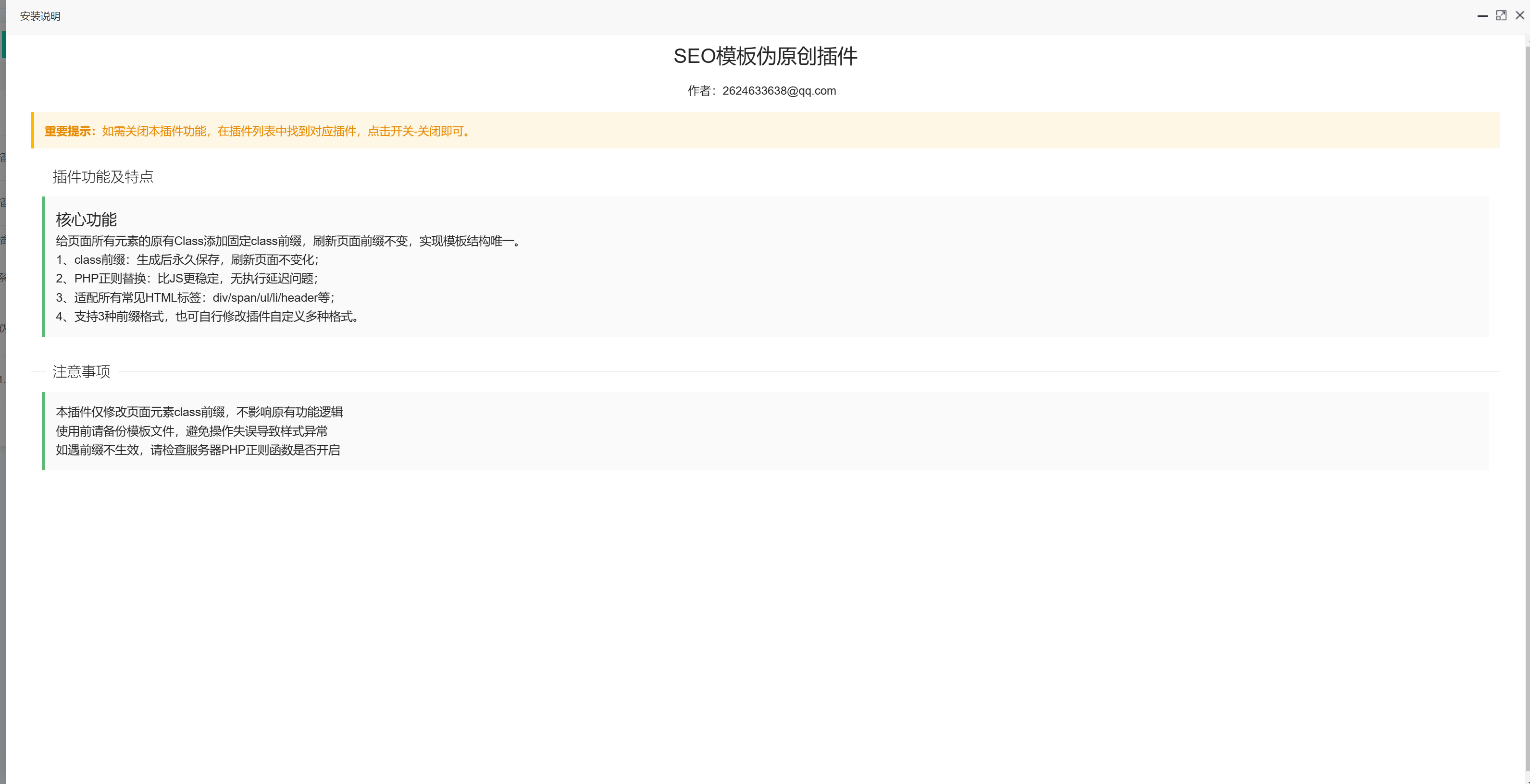 SEO模板伪原创插件,自动给HTML元素添加随机Class干扰码,实现模板结构全网唯一 自动给网站所有 HTML 元素的 class 属性添加「固定唯一前缀」,无需手动修改模板代码,一键实现模板结构差异化,提升搜索引擎对网站的原创识别度,助力 SEO 排名优化。
